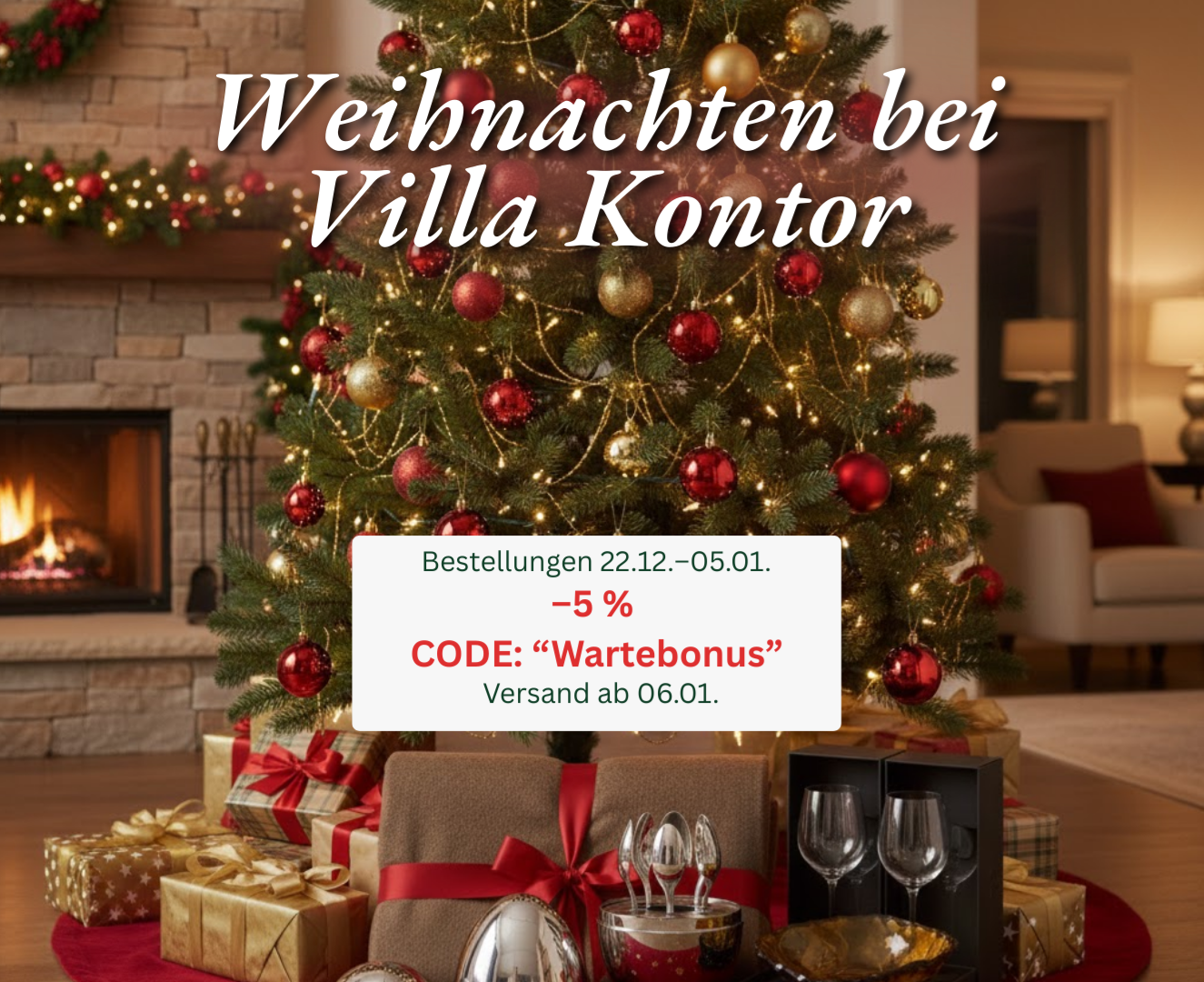 Letzter Versand vor Weihnachten am 23.12. Bestellungen vom 19.12. bis 05.01. werden ab dem 06.01. versendet – als Dankeschön erhalten Sie 5 % Wartebonus.