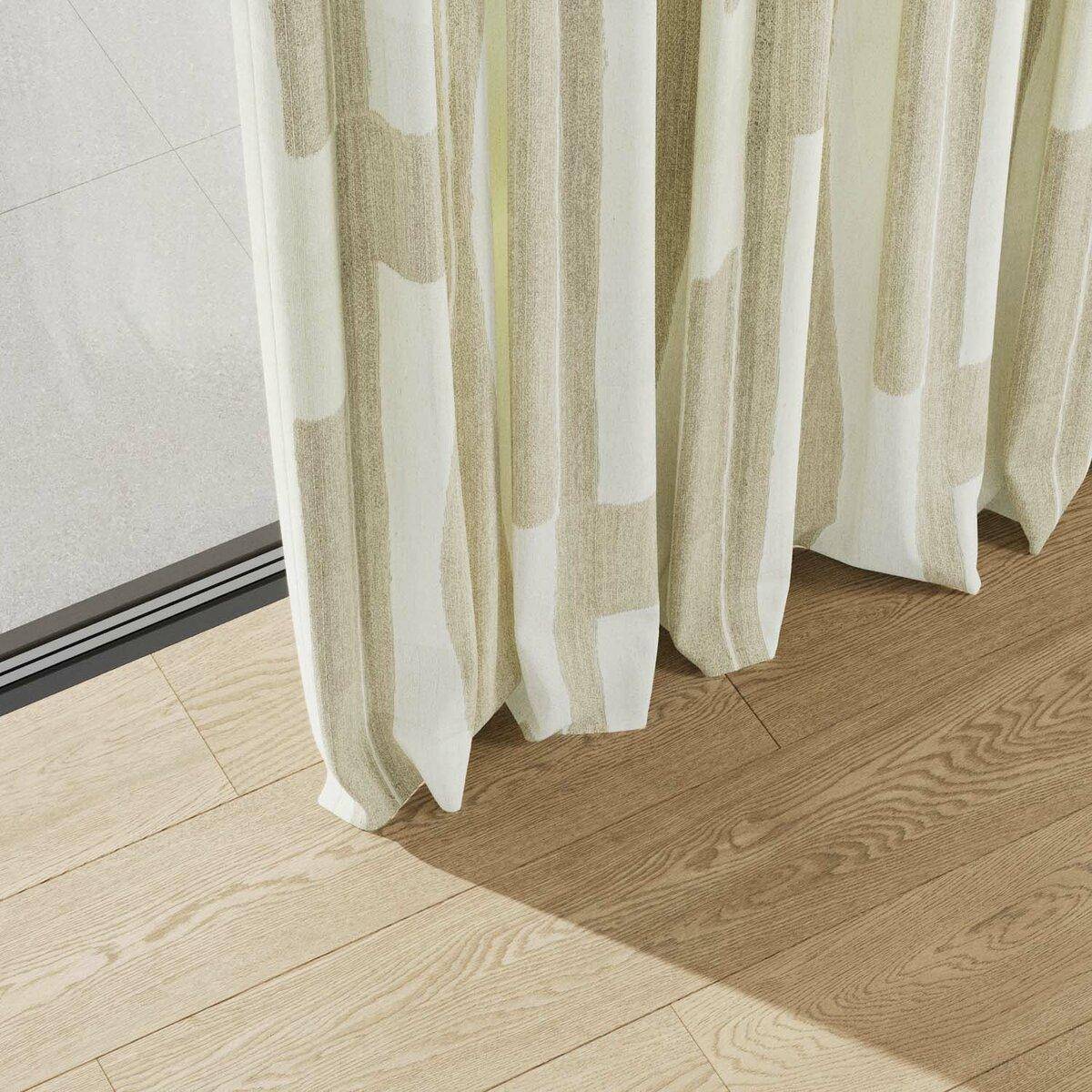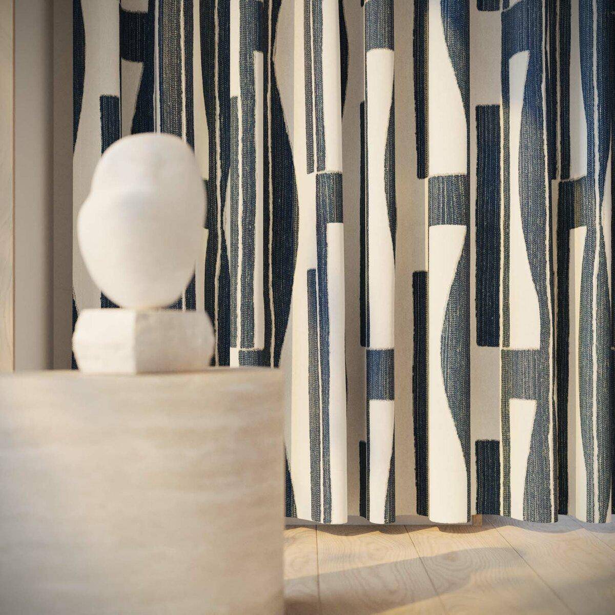 Das raffinierte Fischgrat-Muster entsteht durch unregelmäßige Jacquard-Bindungen und melierte Garne, die dem Stoff weiche Konturen und eine dynamische Textur verleihen. Der dezente Leinenanteil sorgt für Natürlichkeit, während die Farbpalette – von Sand und Leinen bis zu tiefem Blau – moderne Understatement-Akzente im Raum setzt.