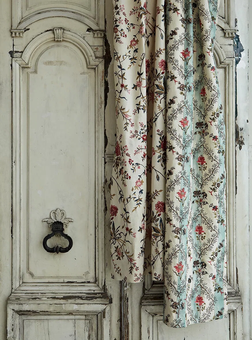 Wir präsentieren Candide, einen dekorativen Vorhangstoff der legendären Marke Braquenie. Dieser prachtvolle Stoff ist eine gestickte Version eines gedruckten und gemalten Musters im Indien-Stil, das sorgsam in unseren Archiven aufbewahrt wird und aus dem 18. Jahrhundert stammt. Die Einzigartigkeit des Candide-Designs liegt im gestreiften Hintergrund – ein Detail, das in der zweiten Hälfte des 18. Jahrhunderts in Europa hoch geschätzt wurde und darauf hindeutet, dass der Stoff ursprünglich speziell für den europäischen Markt entworfen wurde.