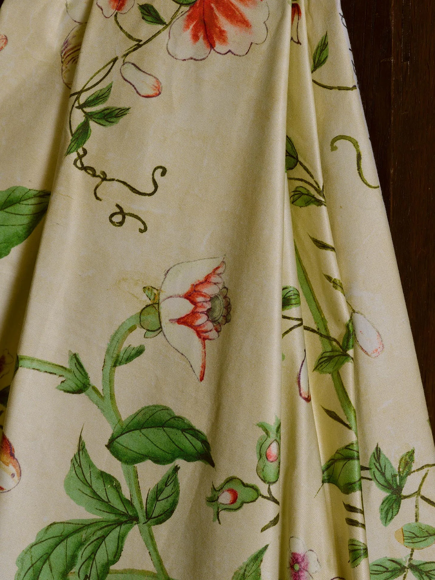 Le paravent chinois chintz Braquenie ist ein Stoff aus 100% Baumwolle, der für Vorhänge, Kissen und Dekorationsartikel konzipiert ist. Das Design basiert auf der Reproduktion eines bemalten chinesischen Paravents aus dem 18. Jahrhundert, der dem legendären amerikanischen Designer John Derian gehörte. Die historische Blumenkomposition wurde unter Beibehaltung der charakteristischen Risse und der patinierten Oberfläche originalgetreu reproduziert, was dem Stoff einen authentischen, säurefreien Charakter verleiht.