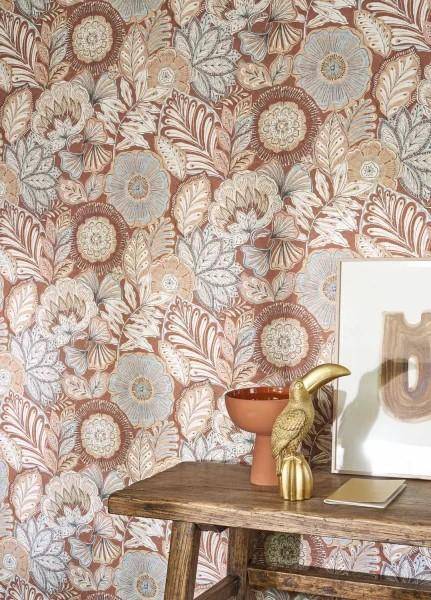 Gönnen Sie sich die Beherrschung der traditionellen Textilmalerei Haben Sie schon von Batik gehört? Diese Technik, bei der mit Wachs auf Stoff gemalt wird, hat in den Werkstätten auf Bali den Status eines Kunstwerks erlangt. Entdecken Sie ihre Meisterschaft auf dieser Tapete, die ein Geflecht aus exotischen Blumen und Blättern auf einem Hintergrund mit Textileffekt zeigt.