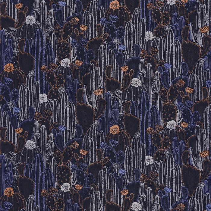 Aus dieser raffinierten und sorgfältigen Zeichnung wächst eine luxuriöse Kaktusplantage. Die Blüten, Stacheln und Formen sind auf einem kohlschwarzen, blendend weißen, mitternachtsblauen, smaragdgrünen oder ockerfarbenen Hintergrund präzise dargestellt. Die Linien werden durch eine oder mehrere Metallic-Tinten verstärkt.