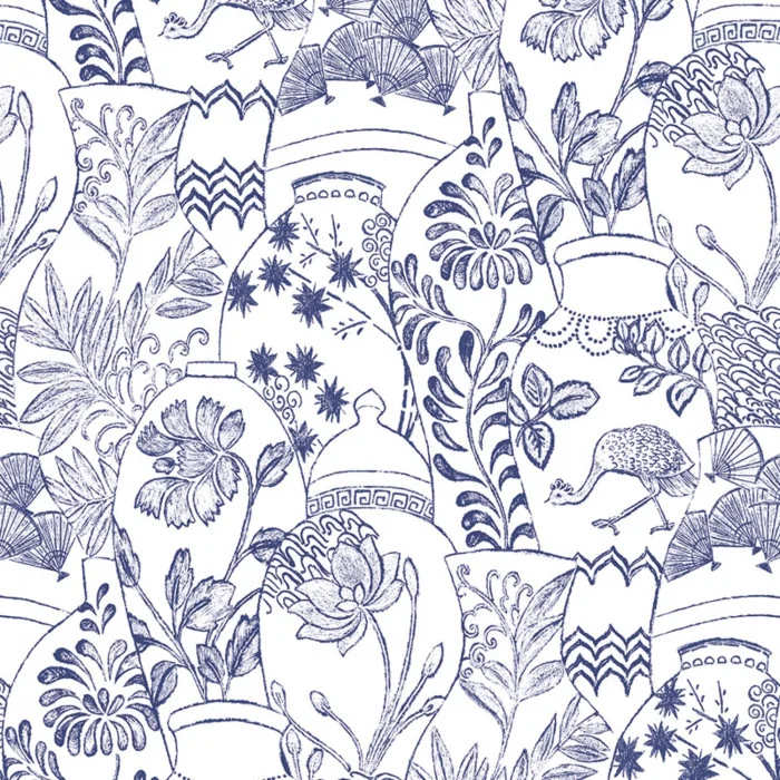 Ein großes Wandbild, das Hunderte von großen Vasen im orientalischen Stil darstellt, wie der Lagerraum eines authentischen asiatischen Ladens. In Farbe oder Weiß und Tinte überschneiden und überlagern sich die Linien und Muster und vermitteln das Gefühl eines Tagtraums.