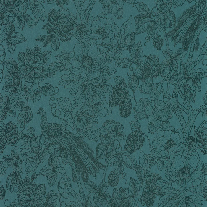 Ein Motiv mit einer Fülle von Blumen, Früchten, Blättern, Zweigen, Ranken und Pfauen mit prächtigem Gefieder, gezeichnet in einer besonders feinen Gravurtechnik. Dieses üppige Stillleben wird mit leicht irisierenden Farben auf einen hellen oder farbigen Hintergrund gedruckt, wodurch raffinierte Kontraste und ein subtiles Funkeln entstehen.