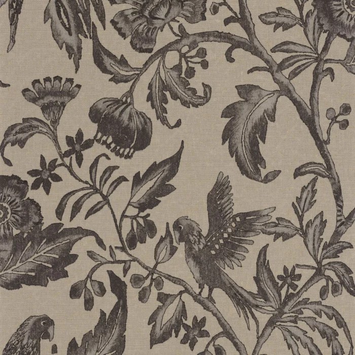 Ein wirbelndes Muster wie ein Vogelflug Auf einem Hintergrund, der an rohes Leinen erinnert, sowohl kostbar als auch natürlich, ein exotisches Muster aus Aras und Blättern... Weit entfernt von der tropischen Tapete, bricht CASADECO mit den Regeln, um an Raffinesse zu gewinnen. Modische Farben wie Cognacbeige oder Salbeigrün, ein nüchternes Design, das mit dem Vintage-Effekt spielt, ein Eindruck von wirbelnder Bewegung.
