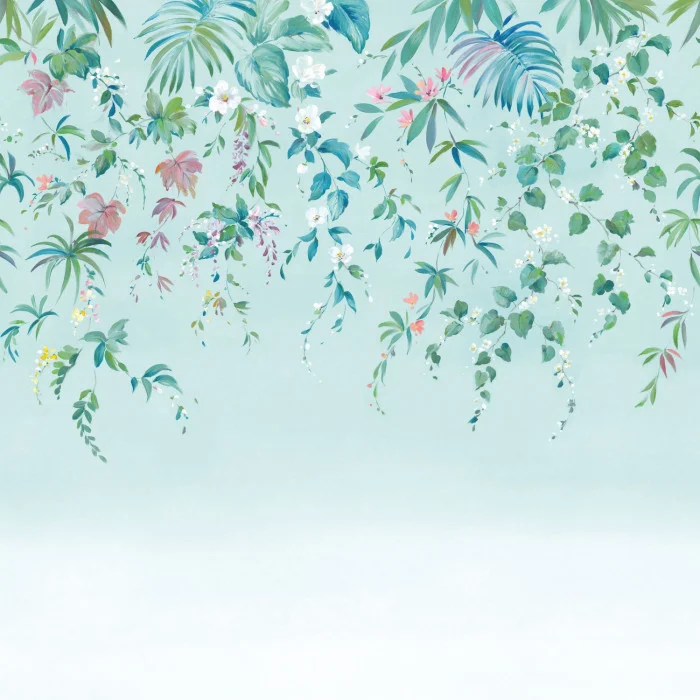 Als wären sie einem azurblauen Himmel entsprungen, ziehen die Blumen vor unseren Augen elegant ihre Bahn. Wir sehen Glyzinien, Passionsblumen und große Palmen. Der Look eines Wintergartens, der sich in einem raffinierten Wohnzimmer fortsetzen lässt.