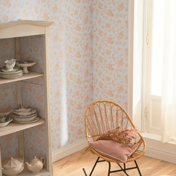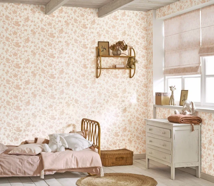 Eine nicht ganz klassische Rose rankt an Ihren Wänden empor; wie eine zarte englische Blume ist „Rosa“ in sanften Pastellfarben gehüllt und bringt mit ihren blassen und pfirsichfarbenen Nuancen eine unübertreffliche Süße in das Zimmer eines jungen Mädchens oder erhellt einen Flur mit ihrem hellen Hintergrund – und warum nicht auch im Wohnzimmer neben einem sanft geschwungenen beigen Sofa?