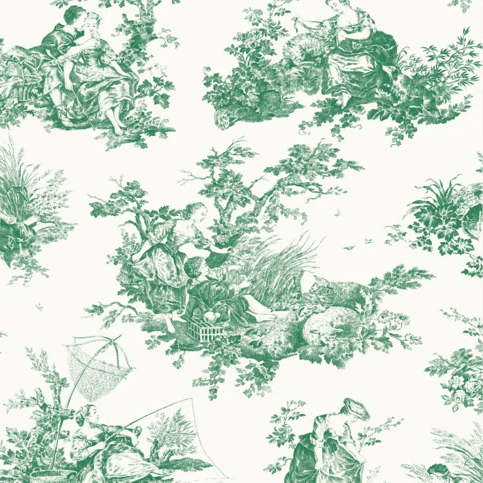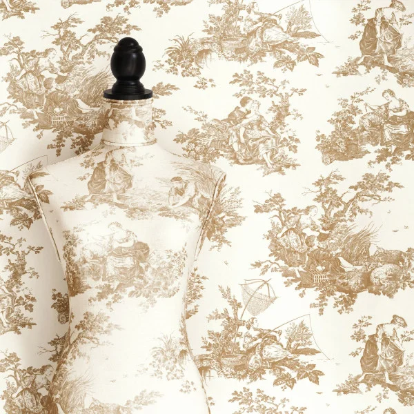 Perfekt abgestimmtes Toile de Jouy hätte selbst Cupido solch romantische Szenen entwerfen können: Eine Dame, die angelt, Liebende, die ein Küken retten oder sich umarmen, ein junges Mädchen, das einen Kranz aus Blumen webt. Der Inbegriff des Landlebens, voll von Details, die alle bezaubernder sind als die anderen.