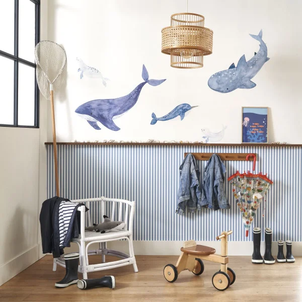 Vorgeklebt und vorgeschnitten, lädt das Sea Life-Dekor die größten Meeresbewohner, insbesondere Wale und Robben, an die Schlafzimmerwände ein.