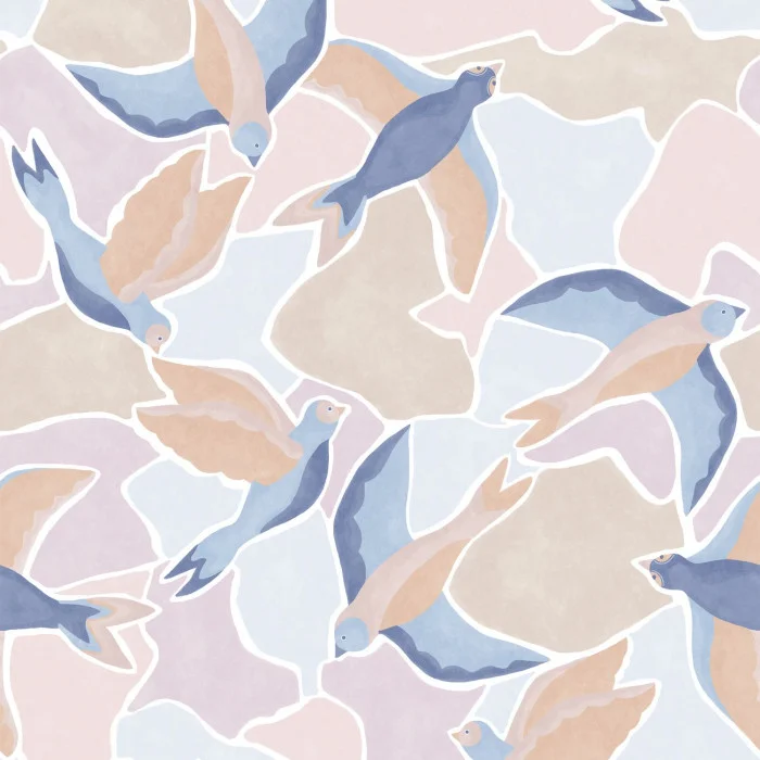 Große Vögel erheben sich in den Himmel. Ein unübertroffen fließendes Panorama, das durch die Sanftheit der Farben Blau/Rosa und Grün/Pfirsich unterstrichen wird. Wir empfehlen Ihnen, diesen schönen Flug in Ihrem Schlafzimmer zu installieren, um die Bewegung zu maximieren, oder in Ihrem Arbeitszimmer, um sich zu bewegen, ohne vom Stuhl aufzustehen!