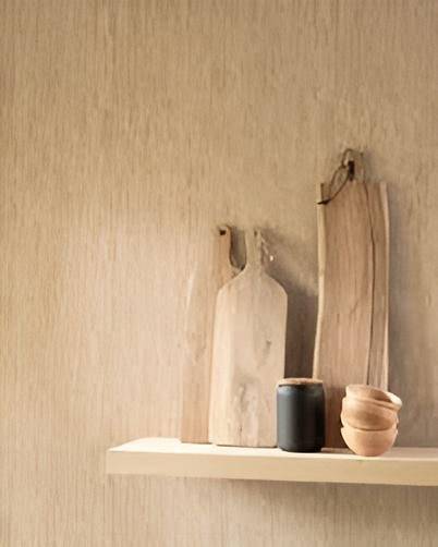 Die Äste, die Spuren des Saftes, die Risse... der Druck „Lärche“ gibt das Design einer breiten Diele auf einer endlosen Fläche getreu wieder. Er vermittelt die Sanftheit des geschliffenen Holzes, sodass man es anfassen möchte. Aufgepeppt mit einem subtilen Glitzereffekt, ist die Wirkung an der Wand großartig.