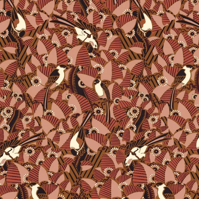 Das Majolikahaus und seine florale Fassade haben ihre Spuren auf dieser Tapete hinterlassen. Das Design des Majolikahauses erinnert an den Stil der Wiener Secession. Das Design und die Geometrie sind harmonisch. Ein Wirbel von Vegetation, wobei die mattschwarze Tinte stilisierte Vögel zur Geltung bringt und die Metallic-Tinte die Leuchtkraft der kleinen Blumen verstärkt. Für dieses Hauptmotiv wurden 5 Filme verwendet, darunter einer aus Sand (mattschwarze Sandtinte) für den Hintergrund und eine Metallic-Tinte für bestimmte Details, deren Platzierung von einer Farbe zur anderen variiert.