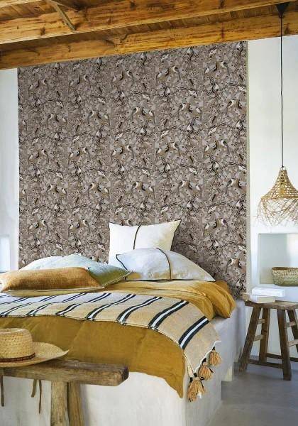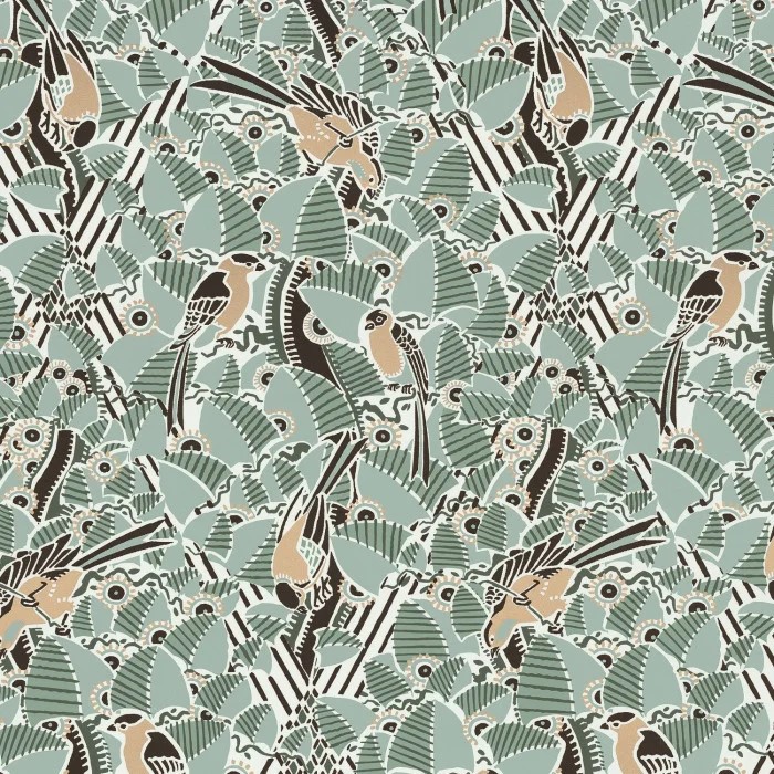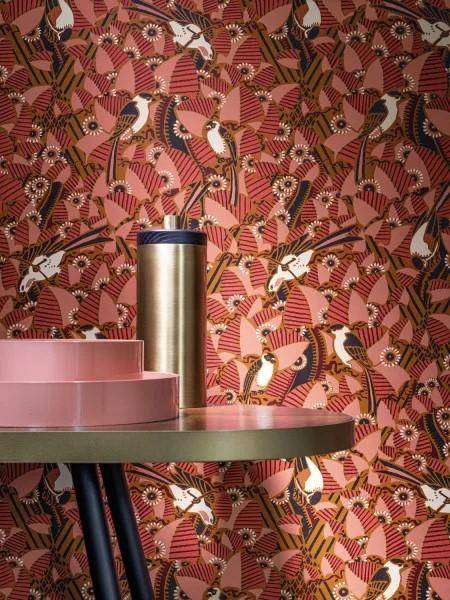 Das Majolikahaus und seine florale Fassade haben ihre Spuren auf dieser Tapete hinterlassen. Das Design des Majolikahauses erinnert an den Stil der Wiener Secession. Das Design und die Geometrie sind harmonisch. Ein Wirbel von Vegetation, wobei die mattschwarze Tinte stilisierte Vögel zur Geltung bringt und die Metallic-Tinte die Leuchtkraft der kleinen Blumen verstärkt. Für dieses Hauptmotiv wurden 5 Filme verwendet, darunter einer aus Sand (mattschwarze Sandtinte) für den Hintergrund und eine Metallic-Tinte für bestimmte Details, deren Platzierung von einer Farbe zur anderen variiert.