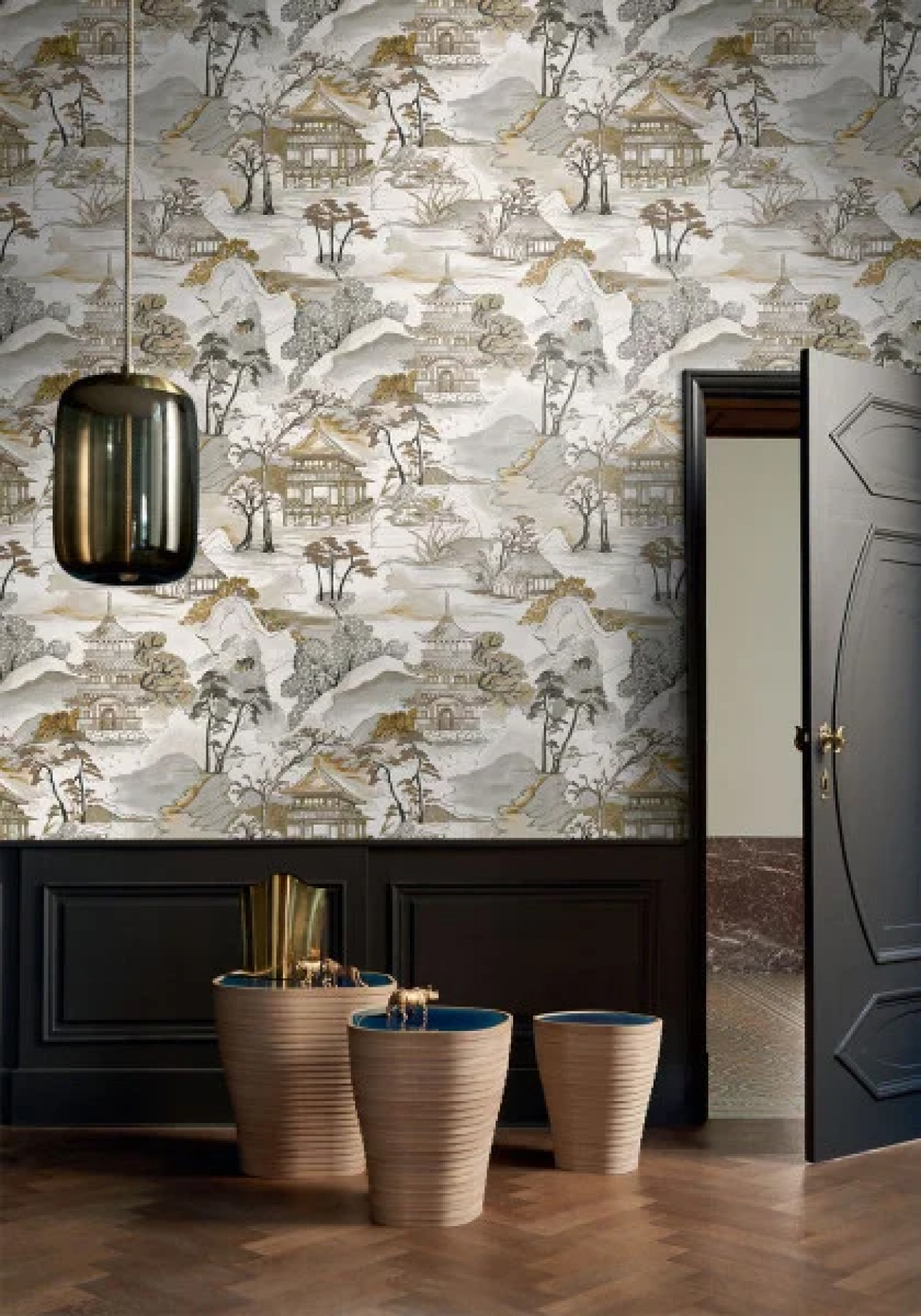 Diese Vinyltapete, inspiriert von der japanischen Präfektur Nara, bringt orientalische Architektur in warmen Farben in Ihr Zuhause und verleiht jedem Raum Charakter.