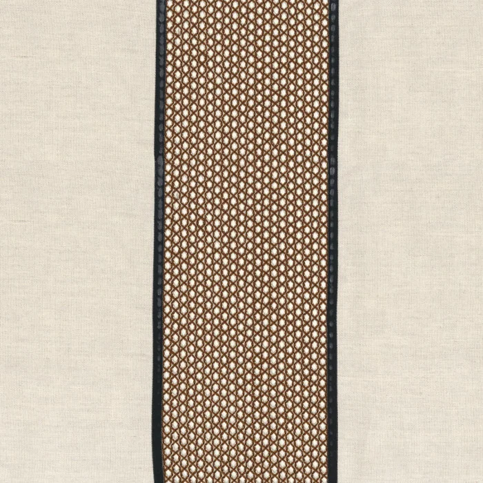 Zentrales Designelement ist ein feiner, gestickter Streifen, der an ein Bienenwabenmuster erinnert. Dieser wird durch ein appliziertes Samtband stilvoll betont und verleiht dem Stoff Tiefe, Struktur und eine luxuriöse Anmutung. Die zarte Geometrie auf natürlicher Baumwoll-Leinen-Basis bringt Bewegung und Rhythmus in den Raum – ganz gleich, ob als eleganter Vorhang oder stilvolles Deko-Element.