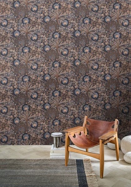 PERSÉE entführt uns in ein Märchen aus Tausendundeiner Nacht, in das Herz einer wunderschönen Oase. Auf einem strukturierten Papier ist ein opulentes Muster orientalischer Vegetation abgebildet, das durch das Licht der Abenddämmerung vergrößert wird. Die Konturen sind mit einer matten sandfarbenen Tinte hervorgehoben, während bestimmte Details mit einer metallischen Tinte verziert sind. PERSÉE ist in fünf tiefen Farben erhältlich, darunter eine sehr leuchtende Version auf einem goldenen Metallic-Hintergrund. Sie passt zur Sanftheit des OPIUM-Samtes.