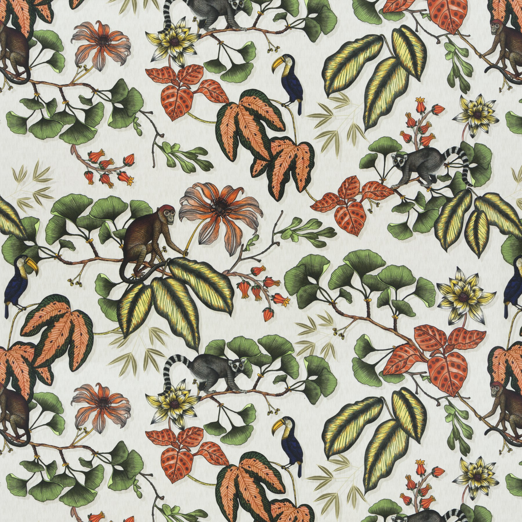 Das lebendige und detaillierte Druckmotiv zeigt tropische Natur: üppige Blätter, leuchtende Blumen, elegante Lemuren und bunte Tukanvögel, die eine Urlaubsstimmung vermitteln und jedem Raum Lebendigkeit verleihen.
