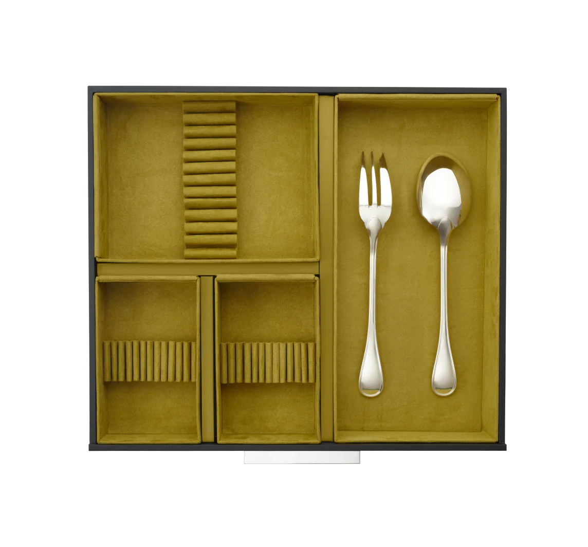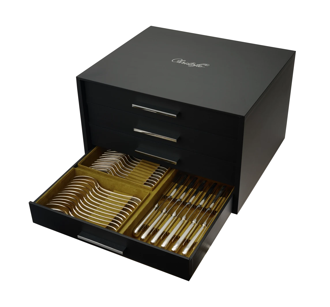 Seit 1830 verkörpert Christofle höchste Silberschmiedekunst und exklusive Handwerksqualität. Auch dieses Besteckset spiegelt diese Tradition wider und bietet eine außergewöhnliche Kombination aus Funktionalität und Luxus. Die elegante Aufbewahrungsbox mit Anlaufschutzstoff schützt das Besteck zuverlässig vor Oxidation und sorgt für eine stilvolle und sichere Lagerung.