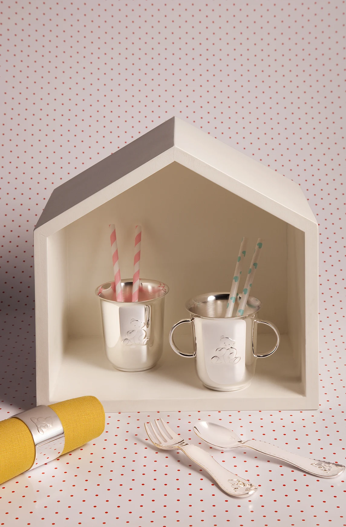 Das Charlie Bear Baby-Besteck versilbert von Christofle bringt Stil, Qualität und kindgerechtes Design in jedes Kinderzimmer. Das zweiteilige Set besteht aus Gabel und Löffel, die beide mit dem beliebten Charlie Bear Plüschtier verziert sind. Die abgerundeten, griffigen Griffe liegen optimal in kleinen Kinderhänden und erleichtern den ersten selbstständigen Umgang mit Besteck.