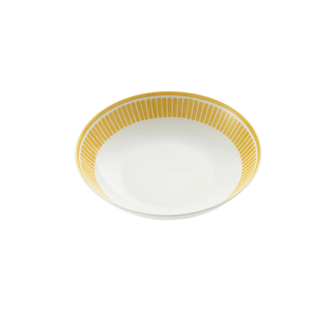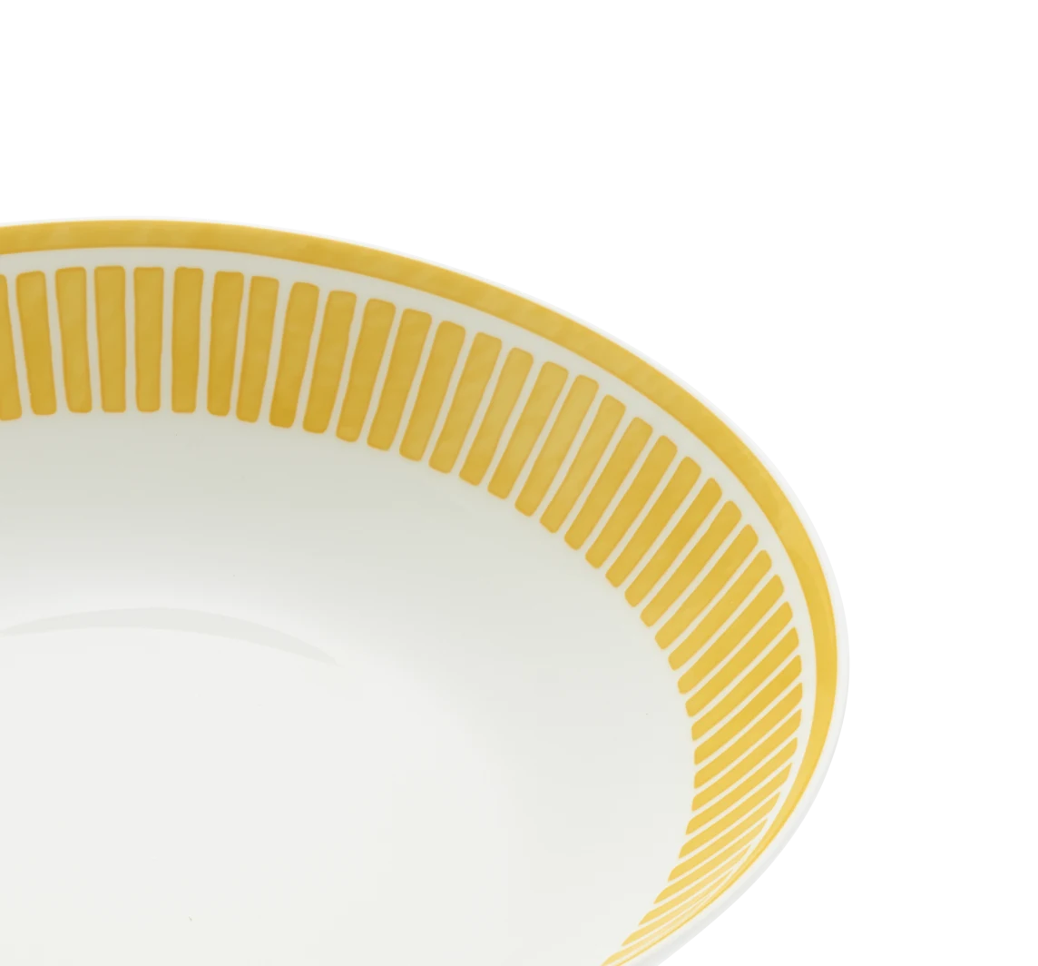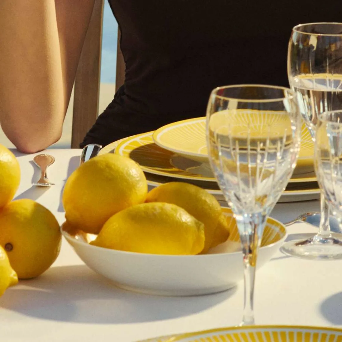 Die Kollektion Malmaison Riviera interpretiert die klassische Malmaison-Ästhetik neu und bringt durch Palmetten, Rosetten und strahlende Linien eine sonnige, lebendige Ausstrahlung auf den Tisch. Jedes Stück fängt das mediterrane Licht ein, betont durch ein zartes, natürliches Aquarellgelb, das das gesamte Tischarrangement erstrahlen lässt.