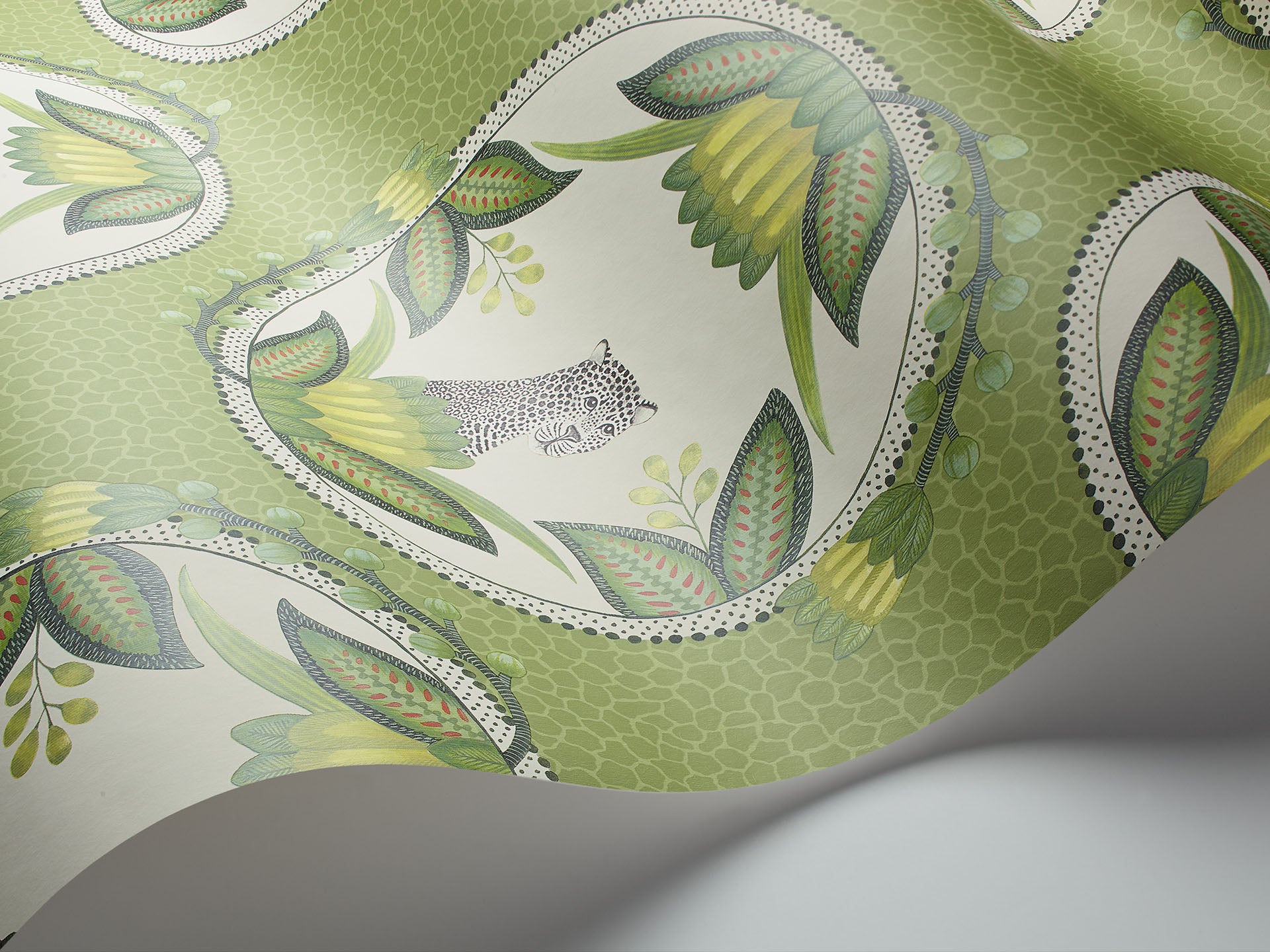 Das Design von Ardmore Cameos ist eine sehr persönliche Darstellung einer Serie von Tellern, die ursprünglich als Hochzeitsgeschenk für einen Freund von Ardmore entstanden sind. Jedes Tierporträt, darunter ein eher hochmütiges Zebra und ein neugieriger Leopard, steht vor einem Hintergrund aus weich gezeichneten Giraffenflecken. Diese entzückende Kartuschentapete wird in den Farben sanftes Oliv, Grau, helles Khaki und ein auffälliges Schwarz-Weiß angeboten.