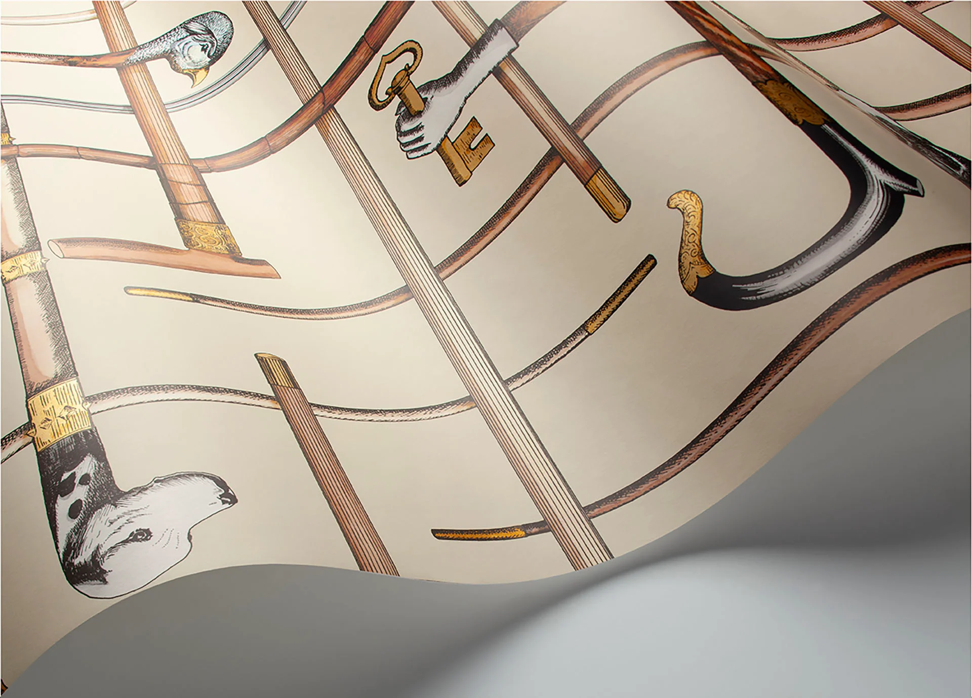 Ursprünglich ein Seidenschal aus den 1940er Jahren, spiegeln die Stöcke von Bastoni den eklektischen Charakter des Hauses Fornasetti wider, in dem es viele Schirm- und Hutständer voller antiker Spazierstöcke gibt. Das grafische Schachbrettmuster des Rapports erinnert an viele Fornasetti-Favoriten und ergibt ein auffälliges und kühnes Motiv. Bastoni wird im Vierfarb-Tiefdruckverfahren gedruckt, um sicherzustellen, dass alle Details gestochen scharf bleiben, und mit metallischen Details in luxuriösem Gold verziert. Wählen Sie aus drei klassischen Farben: Creme, Racing Car Green und Charcoal.