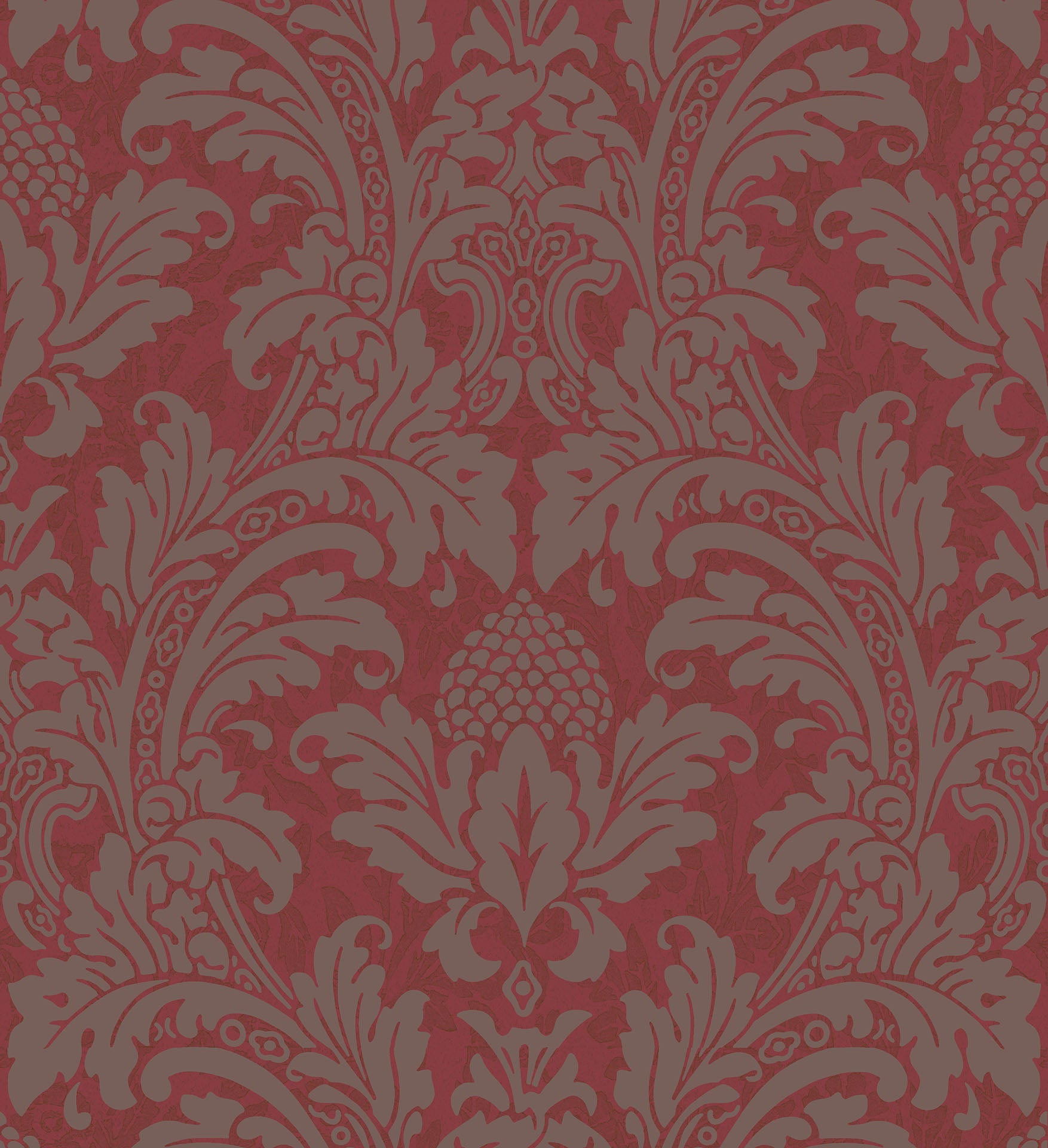 Blake ist ein klassisches Damastmuster mit Oberflächendruck, das über subtil gemusterte Gründe in tiefem Rot, sattem Metallic-Gold, Teal und Zinn gelegt wird.