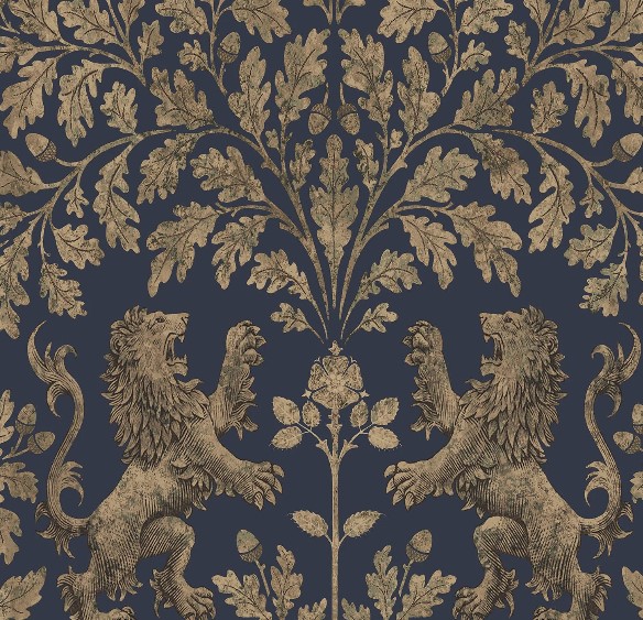 Boscobel Oak kombiniert viele der monarchischen Symbole Englands wie die Tudor-Rose, den brüllenden Löwen und den Eichenbaum und ist eine einzigartige Interpretation des traditionellen Damastdrucks. Benannt nach der großen Eiche im Wald von Boscobel, die Karl II. half, den ihn verfolgenden Roundhead-Soldaten zu entkommen, und später Royal Oak genannt wurde, ist es eine Ode an das königlichste aller englischen Symbole. Es ist in vergoldeten Paletten erhältlich, die die wunderschön gealterten Strukturen oxidierter Metalle imitieren, darunter Metallic Antique Gold auf Schwarz, Metallic Gold auf Hafer, Metallic Autumnal Gold auf Claret und Metallic Gilver auf Ink