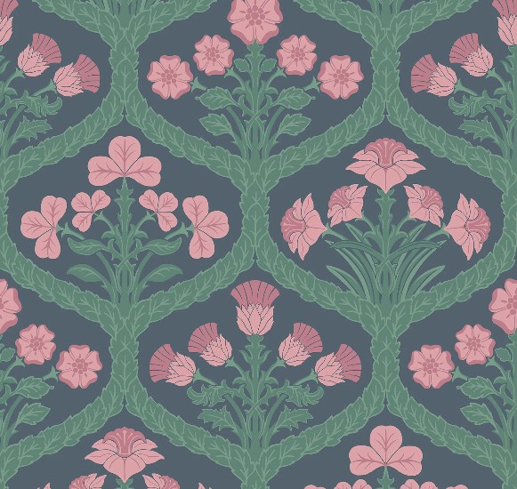 Floral Kingdom , inspiriert vom Design des Gothic Revival, ist ein weicheres Rautendesign aus knorrigen Blättern und den jeweiligen Nationalfarben des Vereinigten Königreichs: Frühlingsnarzissen für Wales, duftende Rosen für England, wuchernde Rosetten aus schottischen Disteln und ein zarter Kleezweig für Nordirland. Wählen Sie aus eleganten Farbpaletten in sanften botanischen Farbtönen wie Ballet Slipper & Leaf Green auf Forest; Rose & Forest auf Charcoal; Lilac & Teal auf Denim; und Mulberry & Olive Green auf Parchment.