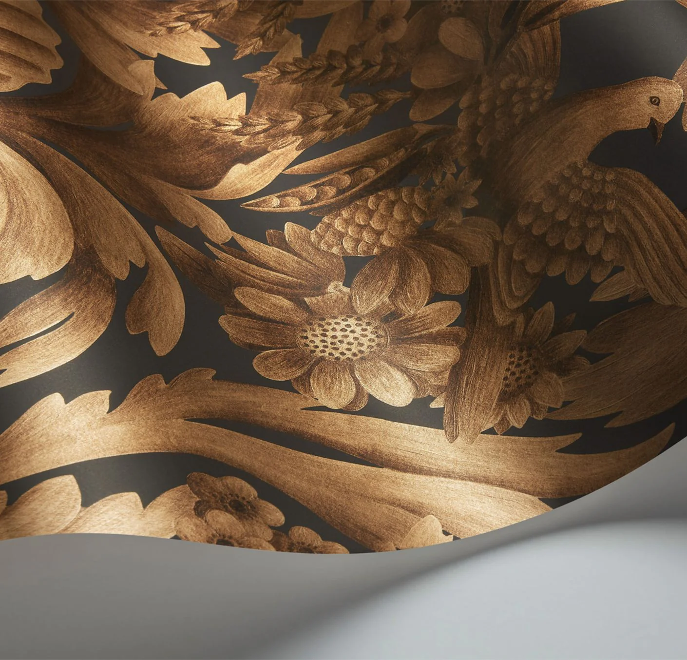 Gibbons Carving ist ein Druck, der auf den unverwechselbaren Stil des Meisterschnitzers Grinling Gibbons aus dem 17. Jahrhundert zurückgeht und voller Details und Tiefe ist, ähnlich wie seine hochreliefartigen Holzschnitzereien. Der Kunsthandwerker, dem nachgesagt wird, dass er die Fähigkeit besaß, „stilles Material zum Leben zu erwecken“, war wegen seiner einzigartigen und delikaten Umsetzung von Lindenholz in die kunstvollsten organischen Strukturen bei den königlichen Kreisen sehr beliebt. In diesem kühnen dekorativen Entwurf stehen natürliche Formen von Vögeln und Muscheln, verschlungenes Blattwerk und die Früchte der Ernte für neues Leben, Überfluss und gute Gesundheit, begleitet von Gibbons' charakteristischer fünfblättriger Blume in Form eines Immergrüns.