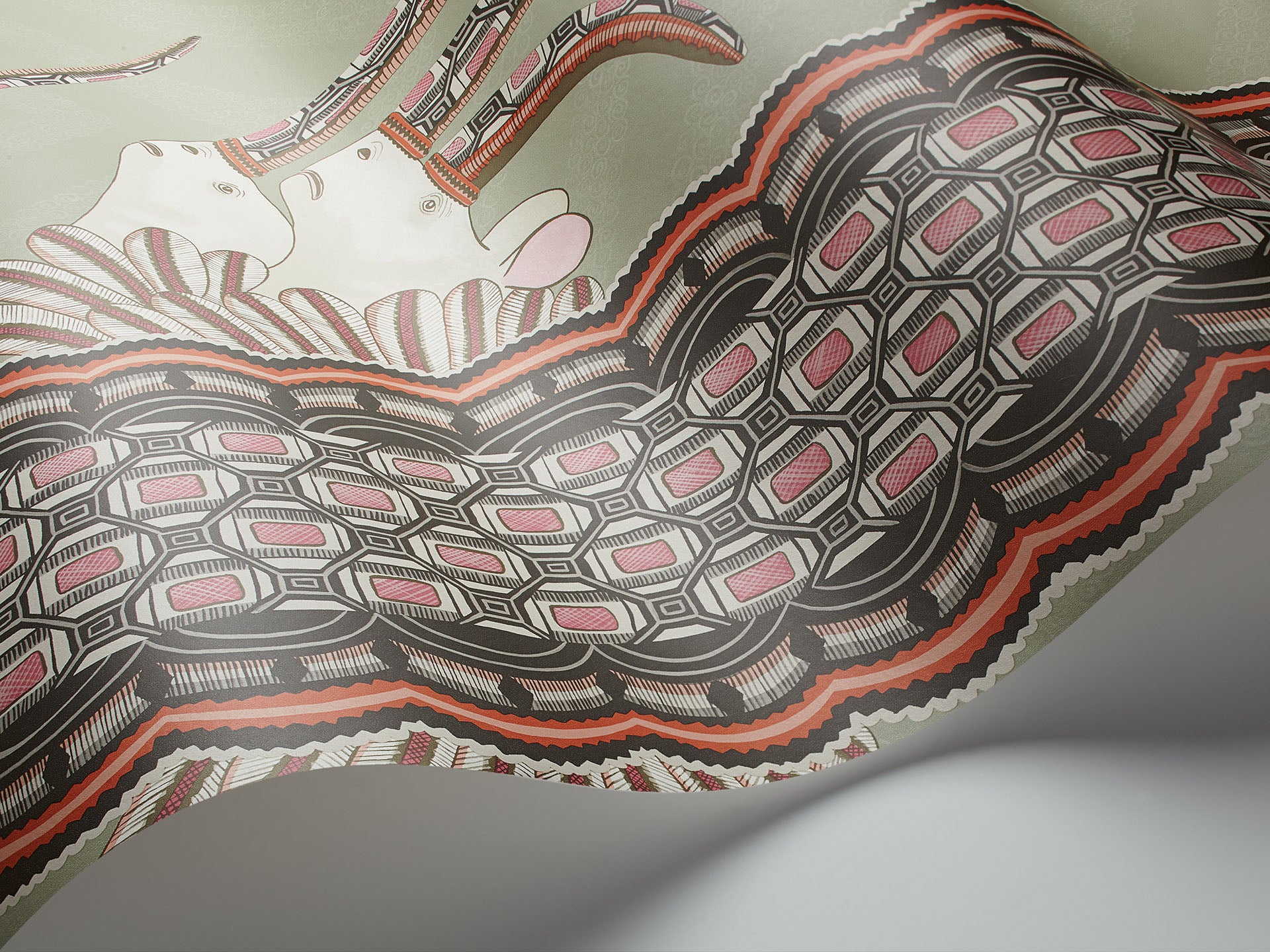 Benannt nach einem der besten Designer von Ardmore, Jabu Nene, ist dieses Design inspiriert von den wunderbar skulpturalen, handgewickelten Nashorngefäßen, die von dem Bildhauer Somandla Ntshanlintshali geschaffen wurden. Diese Gefäße werden dann von Jabu Nene selbst kunstvoll in schillernden Farben und Mustern bemalt und gehören nun zu den beliebtesten Stilen von Ardmore. Die Künstler von Cole & Son haben die Markierungen auf diesen Töpfen verwendet, um einen wunderbar reichen und lebendigen vertikalen Streifen zu kreieren, aus dem ein Paar königlicher weißer Nashörner mit geschmückten Hörnern und gefiederten Halskrausen herausschaut. Diese Tapete ist von echtem afrikanischem Geist geprägt und erinnert mit ihren Mustern an die Korbflechterei der Zulu. Sie ist in fünf auffälligen Farben erhältlich, darunter scharfe schwarze, weiße und graue Neutraltöne sowie erdige Oliv- und Tabakfarben und ein marineblaues und orangefarbenes Stammesmuster.