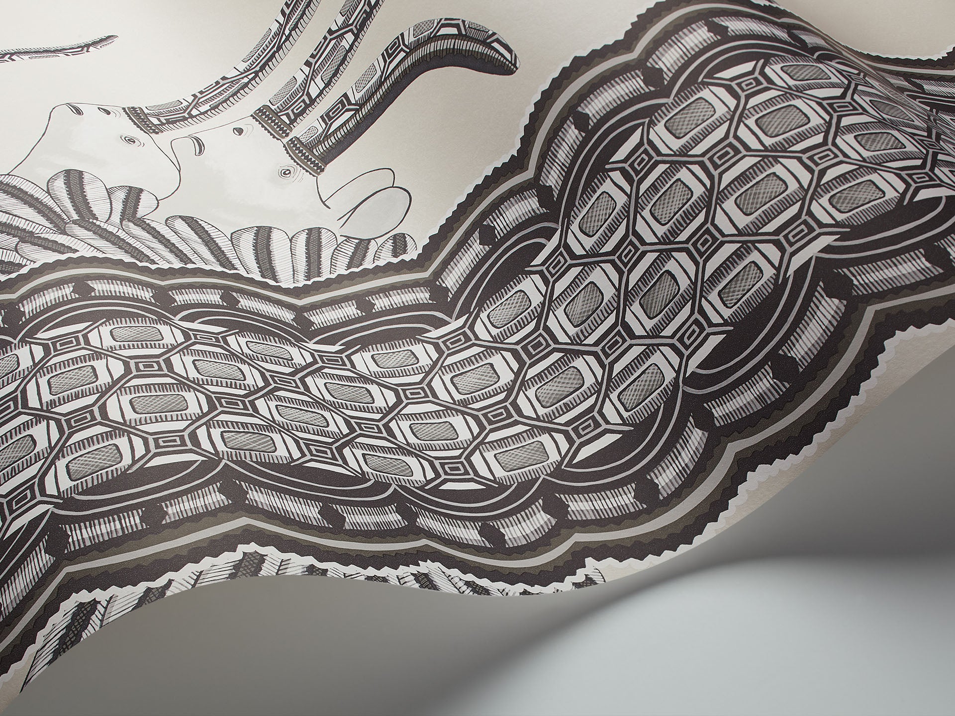 Benannt nach einem der besten Designer von Ardmore, Jabu Nene, ist dieses Design inspiriert von den wunderbar skulpturalen, handgewickelten Nashorngefäßen, die von dem Bildhauer Somandla Ntshanlintshali geschaffen wurden. Diese Gefäße werden dann von Jabu Nene selbst kunstvoll in schillernden Farben und Mustern bemalt und gehören nun zu den beliebtesten Stilen von Ardmore. Die Künstler von Cole & Son haben die Markierungen auf diesen Töpfen verwendet, um einen wunderbar reichen und lebendigen vertikalen Streifen zu kreieren, aus dem ein Paar königlicher weißer Nashörner mit geschmückten Hörnern und gefiederten Halskrausen herausschaut. Diese Tapete ist von echtem afrikanischem Geist geprägt und erinnert mit ihren Mustern an die Korbflechterei der Zulu. Sie ist in fünf auffälligen Farben erhältlich, darunter scharfe schwarze, weiße und graue Neutraltöne sowie erdige Oliv- und Tabakfarben und ein marineblaues und orangefarbenes Stammesmuster.