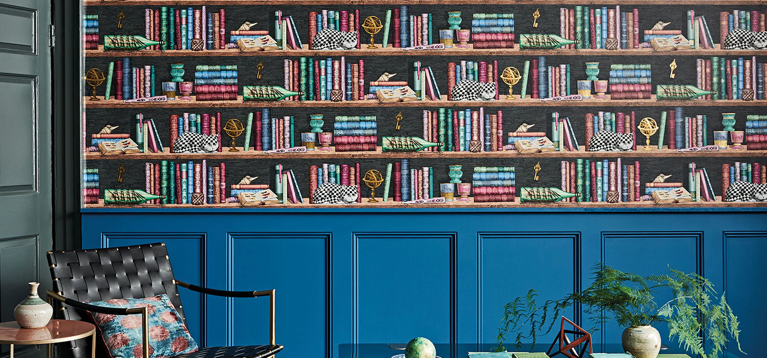 Libreria erweitert eines der ikonischsten Fornasetti-Motive, nämlich ledergebundene Bücher, um eine „Bibliothek“ von Kunstgegenständen und Glaswaren, die die Regale schmücken. Die juwelengleiche Rich-Multi-Palette aus Smaragd, Saphir und Rubin ist eine schillernde Augenweide, mit subtilen Goldmetallic-Highlights auf Buchrücken, Glaswaren-Details und jedem goldenen Ornament für eine reiche und dekadente Wandverkleidung.