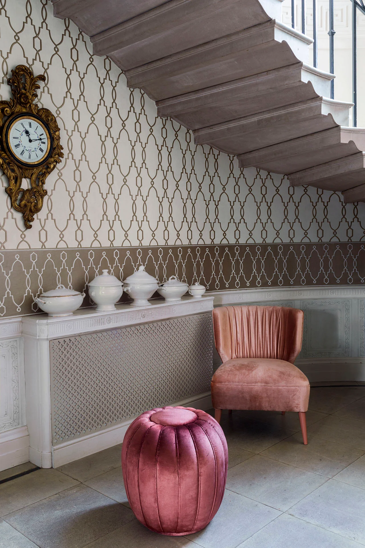 Parterre ist ein zartes Spaliermuster, das von den komplizierten Gartenmustern des 16. und 17. Jahrhunderts in Frankreich inspiriert wurde, die noch heute in vielen Parks und Gärten zu finden sind. Dieses Muster ist in reizvollen Farben gedruckt, darunter Stein, Anthrazit, französisches Grau, Kobalt, Grün, klassisches Rot und Metallic-Gold.