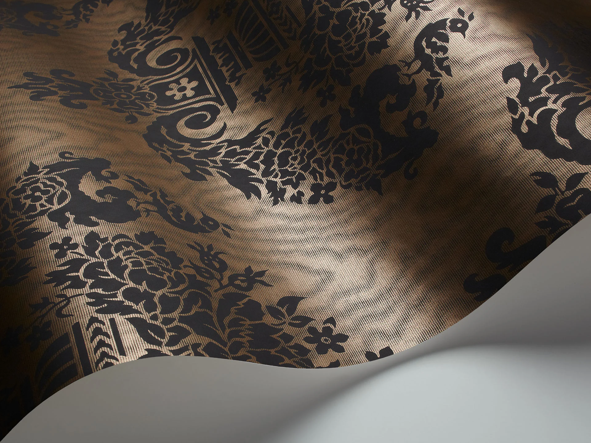 Sudbury ist eine mittelgroße Damasttapete im klassischen Stil auf einem Moiré-Grund mit Seideneffekt, auf dem Urnen und Girlanden abgebildet sind. Sie wird in den Farbtönen Hafer, Print Room Blue, Dark Linen und Schwarz auf Metallic Bronze angeboten.