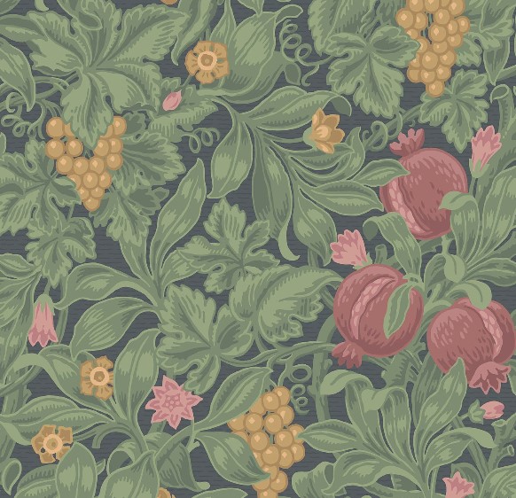 Als Hommage an Pomona, die römische Göttin der Ernte und des fruchtbaren Überflusses, zeigt dieses vom Kunsthandwerk inspirierte Design ein üppiges Füllhorn aus Früchten und Reben. Dieses Fest der Natur und der traditionellen Handwerkskunst zeigt sich in den klassischen botanischen Farben Ocker und Olivgrün auf Creme sowie Karmesin und Oliv auf Anthrazit, aber auch in den modernen Farbtönen Gebranntes Orange und Teal auf Petrol sowie Teal und Viridian auf Denim.