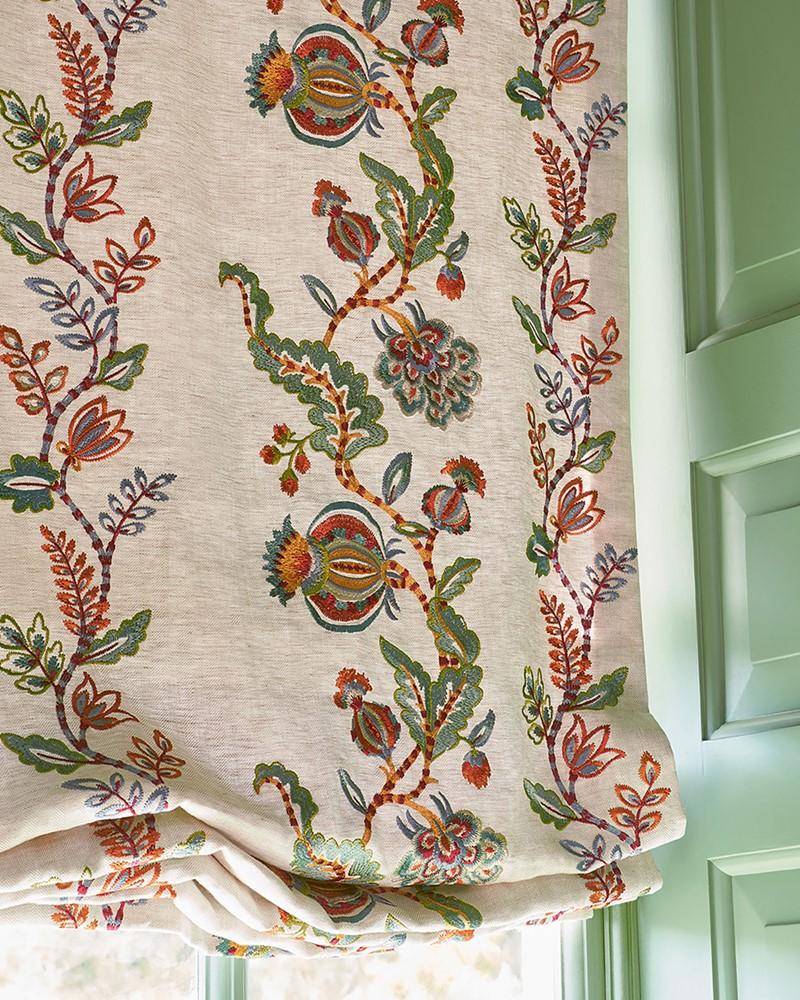Ein ansprechender gestickter Streifen mit einer lebendigen Kombination aus organischen Formen und Blättern, die in kräftigen, schweren Stichen ausgeführt sind. Ariadne hat einen großen Charakter und eine überschaubare Größe. Die satten Farben passen gut zu einem Grundgewebe aus Leinen mit Fischgrätmuster.
