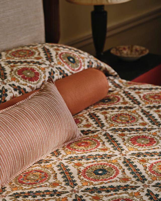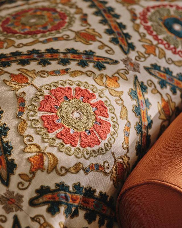 Der Deko- & Polsterstoff Amarantha von Colefax & Fowler inspiriert durch historische Suzani-Stickereien und verbindet traditionelle Muster mit modernen Anforderungen. Klassische kreisförmige Suzani-Motive werden kunstvoll in ein rautenförmiges Gitter eingebettet, das durch mehrfarbige Details eine faszinierende Tiefe erhält.