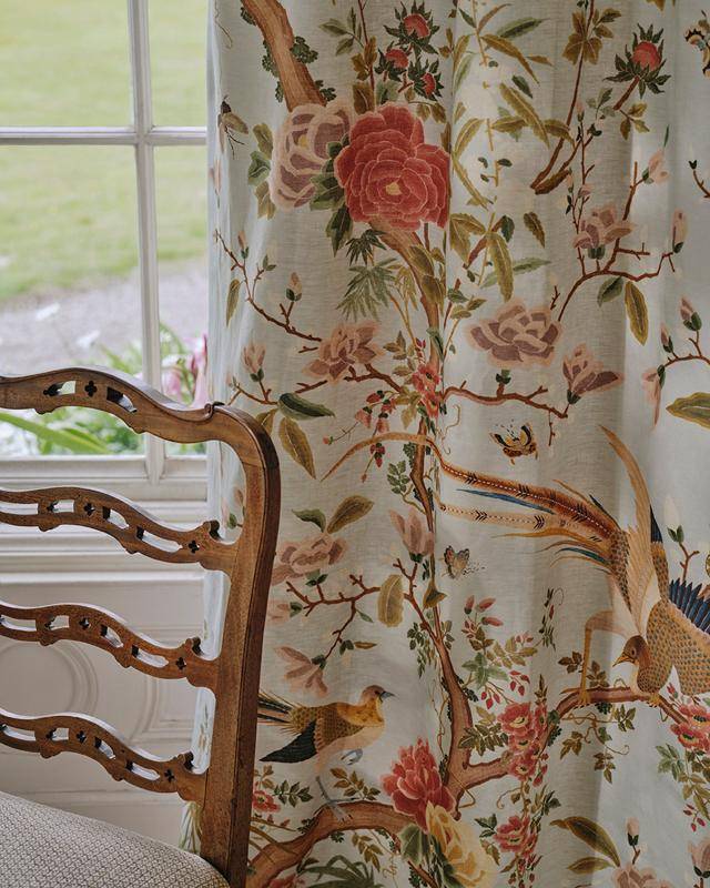 Der Deko- & Vorhangstoff Belmont Trail von Colefax & Fowler ist eine elegante Weiterentwicklung der klassischen Belmont-Tapete. Das großflächige Chinoiserie-Motiv zeigt exotische Vögel, Bambus und blühende Blumen und ist auf einem feinen Leinengewebe gedruckt, das die Detailgenauigkeit handbemalter Wandpaneele nachbildet.