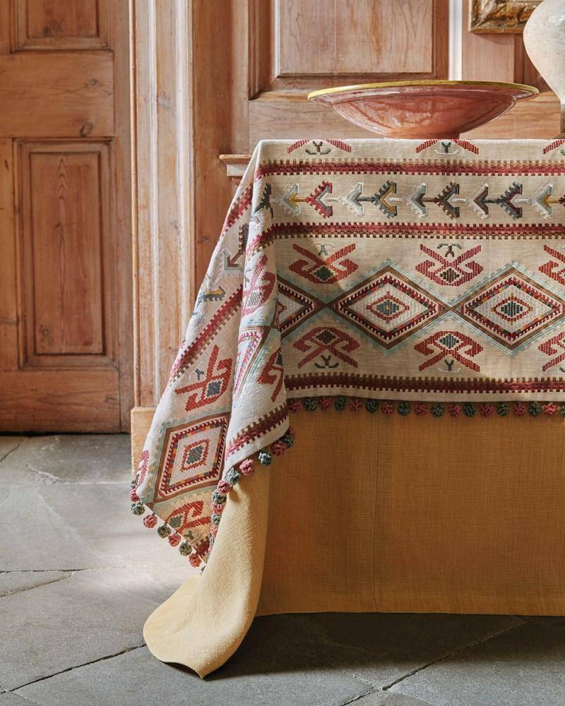 Inspiriert von den leuchtenden Farben und komplizierten Motiven antiker Kelim-Teppiche, zeigt Castille stark bestickte geometrische Formen in einem Streifenmuster. Eine Reihe von Rauten erzeugt einen visuell fesselnden Effekt auf einem Grund aus reinem Leinen mit Fischgrätmuster.