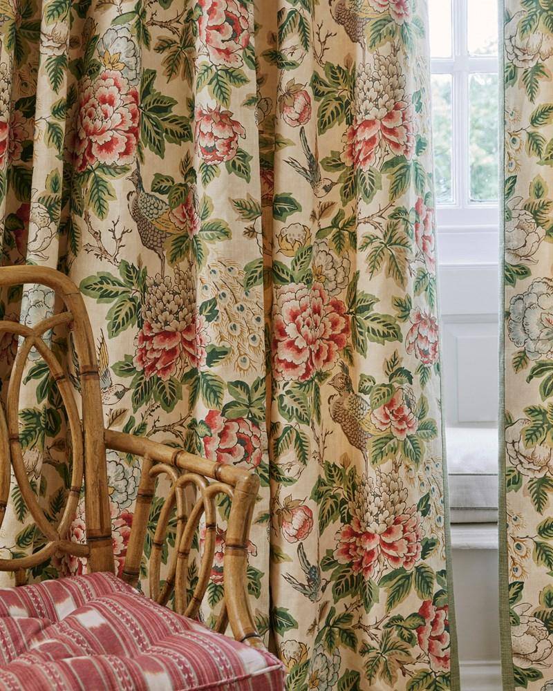 Chilgrove zeigt eine üppige Pracht blühender Pfingstrosen, die durch einen Pfau ergänzt wird, der stolz sein buntes Schwanzgefieder inmitten von üppigem Laub präsentiert. Zarte Vögel flattern zwischen den Blüten und verleihen der Szene ihren Charme. Inspiriert von den bezaubernden Motiven der Chinoiserie, zelebriert dieses Design die komplizierten Muster und lebhaften Farben, die von einem antiken Dokument stammen.