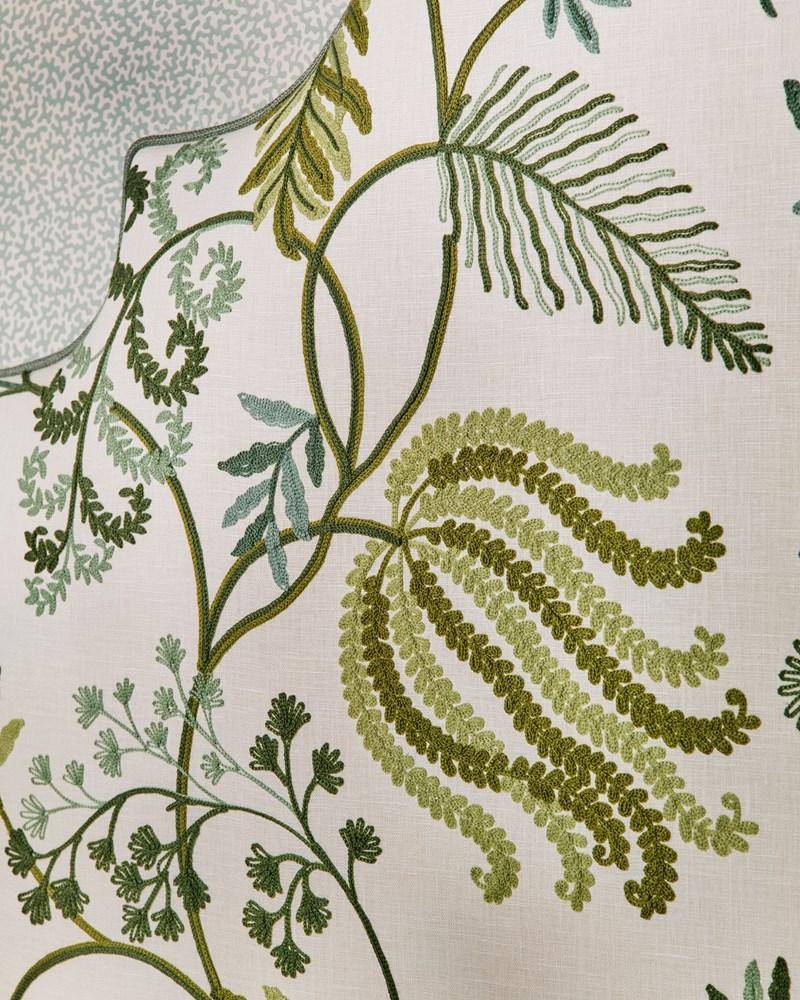 Ferntree ist botanisch inspiriert und zeigt eine bezaubernde Anordnung von Farnwedeln, die sich anmutig an einem skurrilen Baum wiegen. Die kettengenähten Blätter mit ihren grafischen Silhouetten und rhythmischen Wiederholungen auf einem cremefarbenen Leinenhintergrund sorgen für eine charmante Schlichtheit.