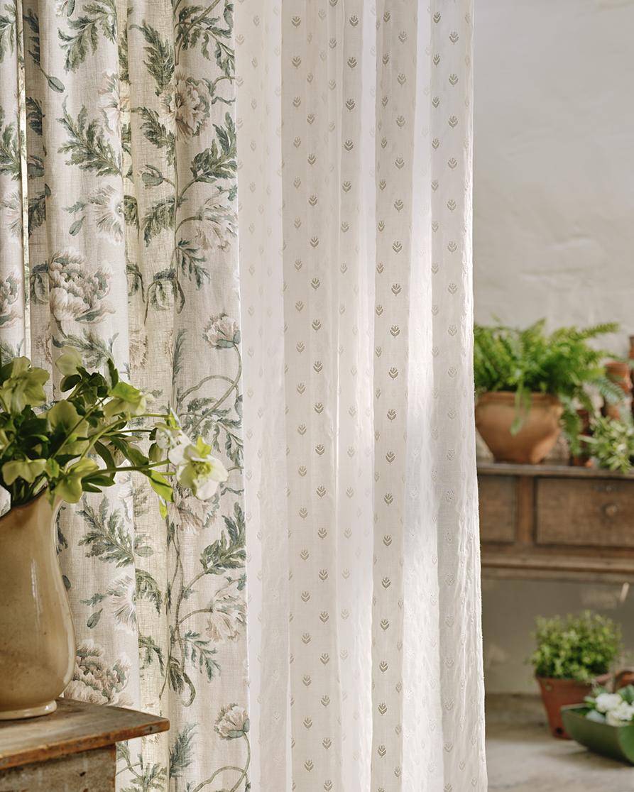 Fritton ist zart auf feinste Baumwolle gestickt und zeigt elegante Einzelblattmotive, die die zeitlose Schlichtheit und raffinierte Handwerkskunst verkörpern, die für die Tücher von Colefax und Fowler stehen.