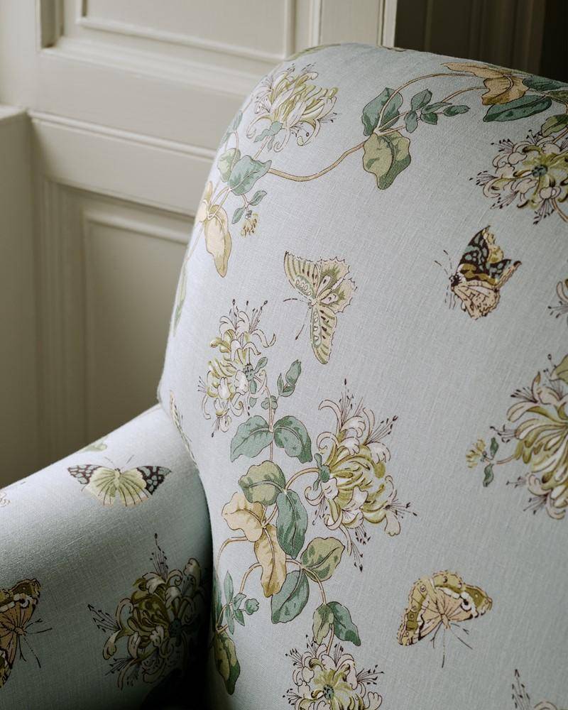 Ein herrlich freier und offener Geißblattweg, der den Geist eines englischen Landgartens mit umherflatternden Schmetterlingen perfekt einfängt. Dieses altbewährte Colefax-Motiv, das jetzt auf reinem Leinen gedruckt ist, wurde nach einem englischen Blockdruck aus den 1840er Jahren reproduziert, der in seinem Stil und seinen Details charakteristisch ist und wahrscheinlich seit über einem Jahrhundert produziert wird.
