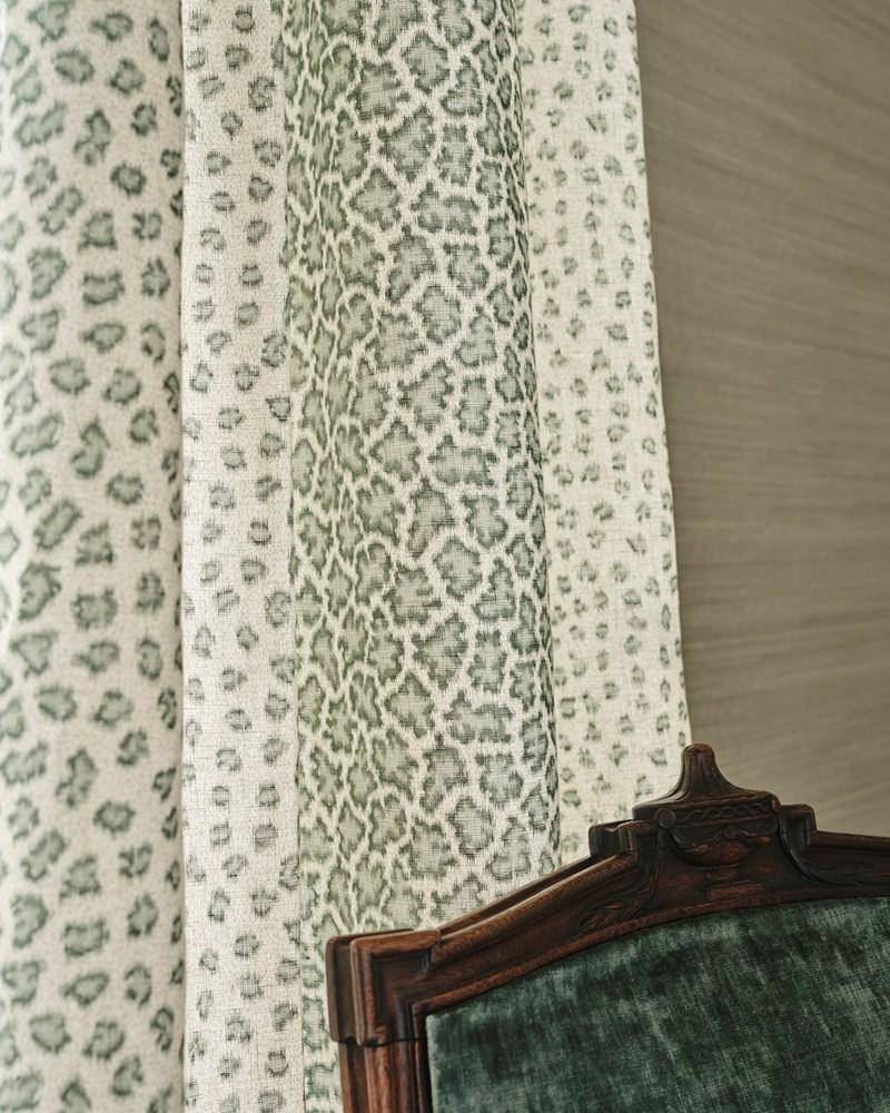 Attraktiv stilisierte, abstrakte Leopardenflecken werden durch eine strukturierte, gerenderte Oberfläche hervorgehoben, die Tierhaut imitiert und einen Kontrast zu dem glatten, reinen Leinenstoff bildet, auf den sie gedruckt sind. Größe und Dichte der Formen verändern sich über das gesamte Muster hinweg, so dass ein weicher Ombre-Streifen mit einer wirklich schicken Persönlichkeit entsteht.