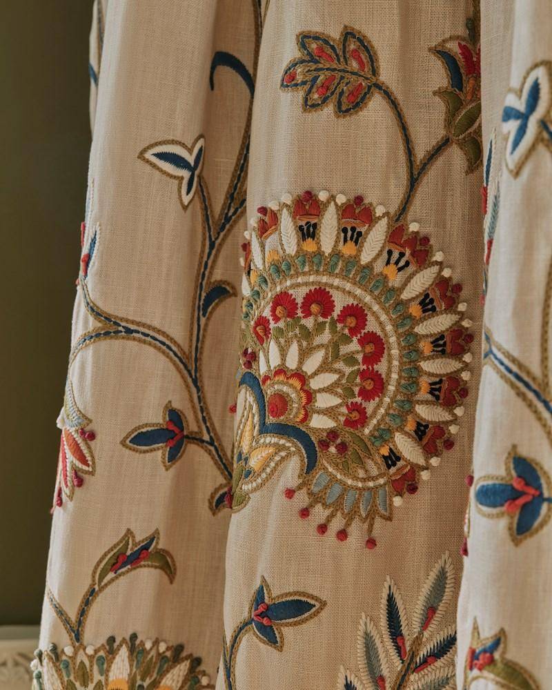 Marquis ist eine Hommage an die Kreativität und das Können handwerklicher Stickerinnen und zeigt eine Reihe von Sticktechniken, darunter komplizierte Kettenstiche und handgenähte Knoten auf einem reinen Leinengrund. Dieses kühn gemusterte Design, das von den reichen Details antiker Paisley-Textilien inspiriert ist, wird durch auffällige Farbkombinationen noch verstärkt.