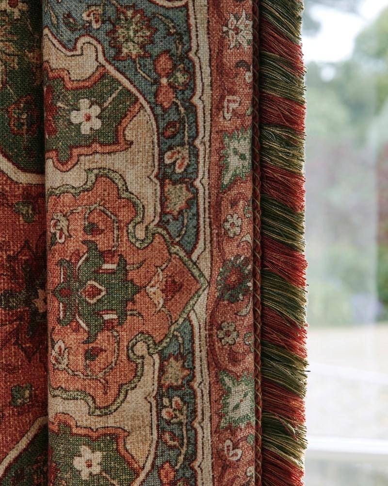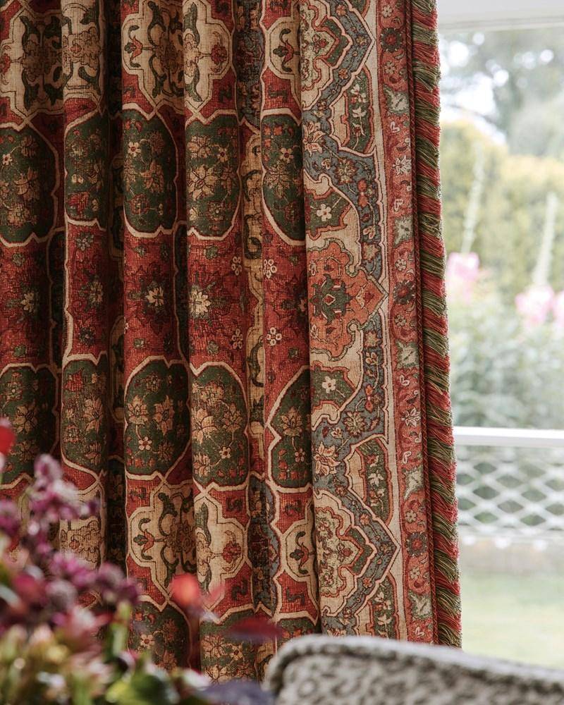 Inspiriert von antiken Suzani-Patchworks, kombiniert dieser reich gemusterte Druck leuchtende Farben mit subtilen Texturen, die das Wesen des Originals wunderbar einfangen. Das Design zeigt klassische kreisförmige Suzani-Formen in einem blattartigen Raster, akzentuiert durch einen zart gemusterten Streifen aus winzigen Blättern. Mit seinen leuchtenden Farben und seiner harmonischen Symmetrie eignet sich Perseus sowohl für Vorhänge als auch für Polstermöbel.