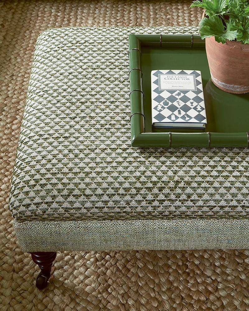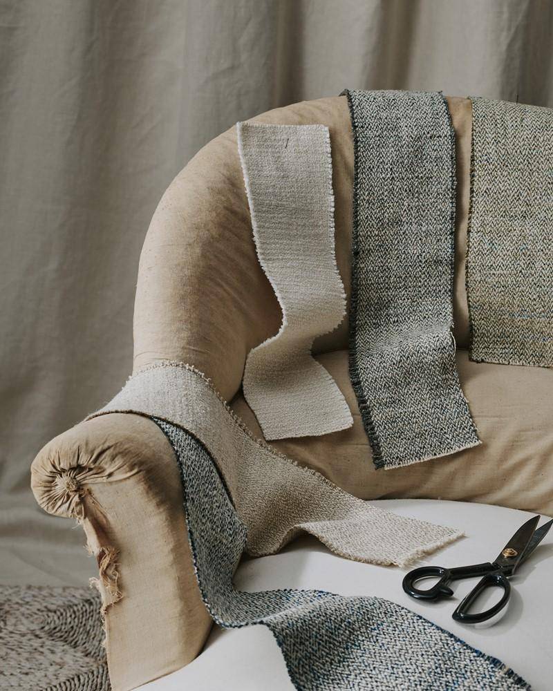 In Belgien gewebt, entsteht der unverwechselbare Charakter dieses individuellen Gewebes durch das spezielle, fasergefärbte Leinengarn. In Kombination mit der kontrastierenden Textur von Jute und Baumwolle entsteht eine gebrochene Köperstruktur, die für zusätzliche Spannung auf der Oberfläche sorgt.