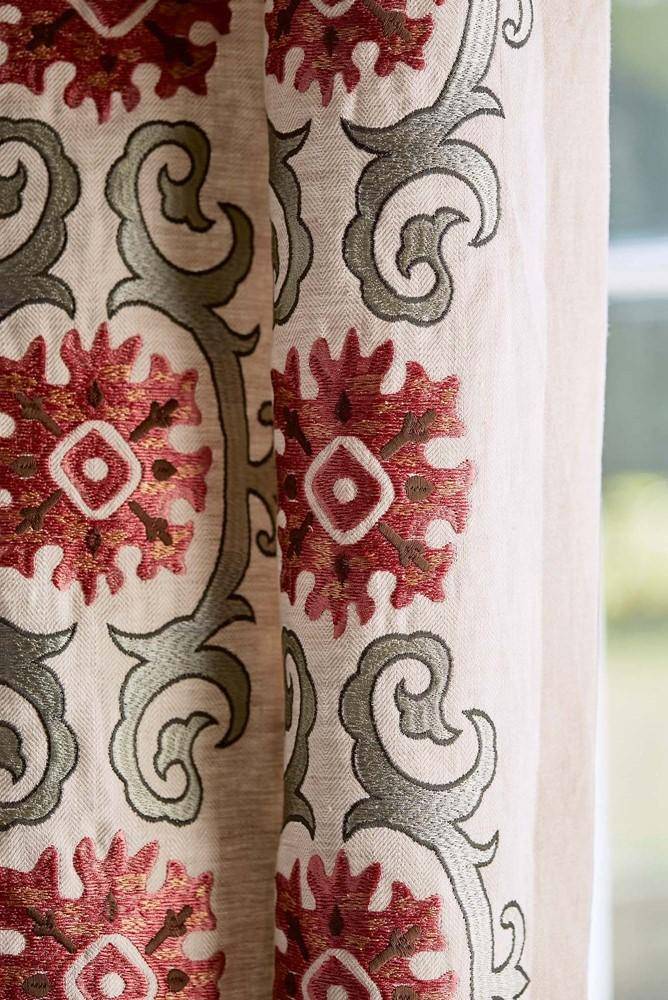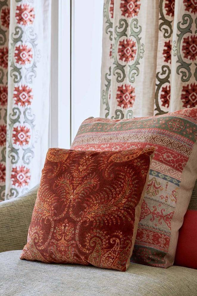 Theodore hat ein formelleres Layout, ist aber dennoch ein vielseitiger dekorativer Streifen, der sich sowohl in der Stadt als auch auf dem Land einsetzen lässt. Die gestickten Motive und die geschwungenen Kartuschenrahmen werden durch gedämpfte Rostrot-, Salbeigrün- und verblasste Petrolblautöne gemildert, die sich wunderbar mit dem garngefärbten Fischgrät-Grundgewebe kombinieren lassen.