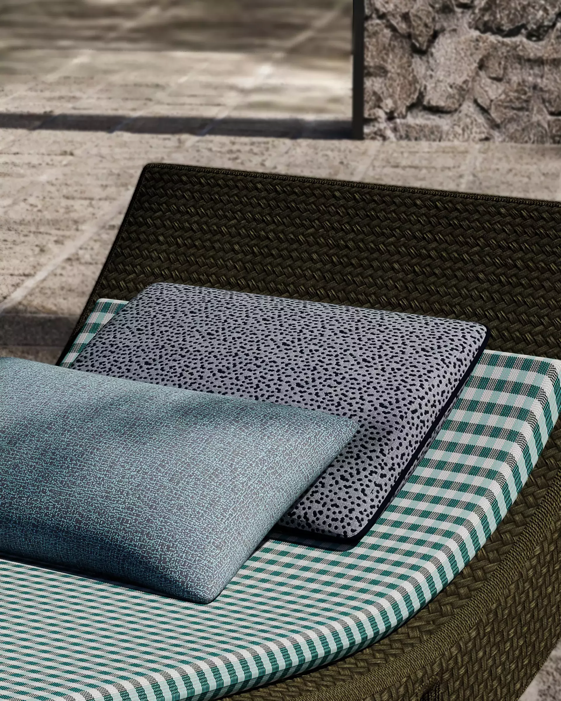 Bezugsstoff für den In- und Outdoor-Bereich. Punkte verteilen sich wie ein gestanztes Lochmuster über die Fläche und geben diesem robusten Doppelgewebe einen verspielten Charakter. Das Gewebe aus 100% spinndüsengefärbtem Acryl ist strapazierfähig und pflegeleicht, wasserabweisend und widerstandsfähig gegen Anschmutzung durch Flecken und Schimmel sowie Ablagerungen und Verfärbungen durch Chlor- und Salzwasser.